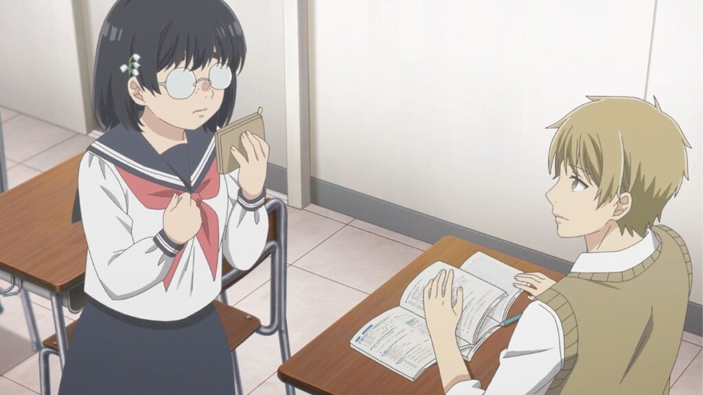 Yosuke, porém, não parece se importar e até elogia a flor. Essa reação inesperada é um dos momentos mais doces de Busu ni Hanataba wo, mostrando que Yosuke é mais gentil do que Hana imaginava. Mesmo assim, ela foge da sala envergonhada.